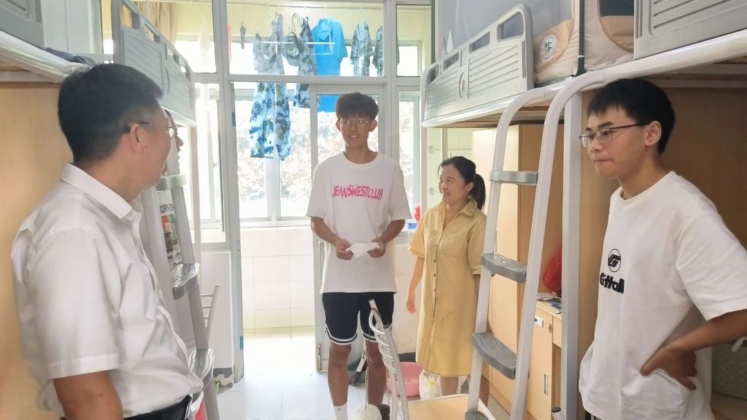学院党委书记陈伟刚,院长赵永好,副院长宋丹,副书记、副院长辛绍权与新生辅导员温泽来到宿舍看望新生,与新同学和家长们亲切交流,询问他们对材料院的第一印象和学习生活感受。