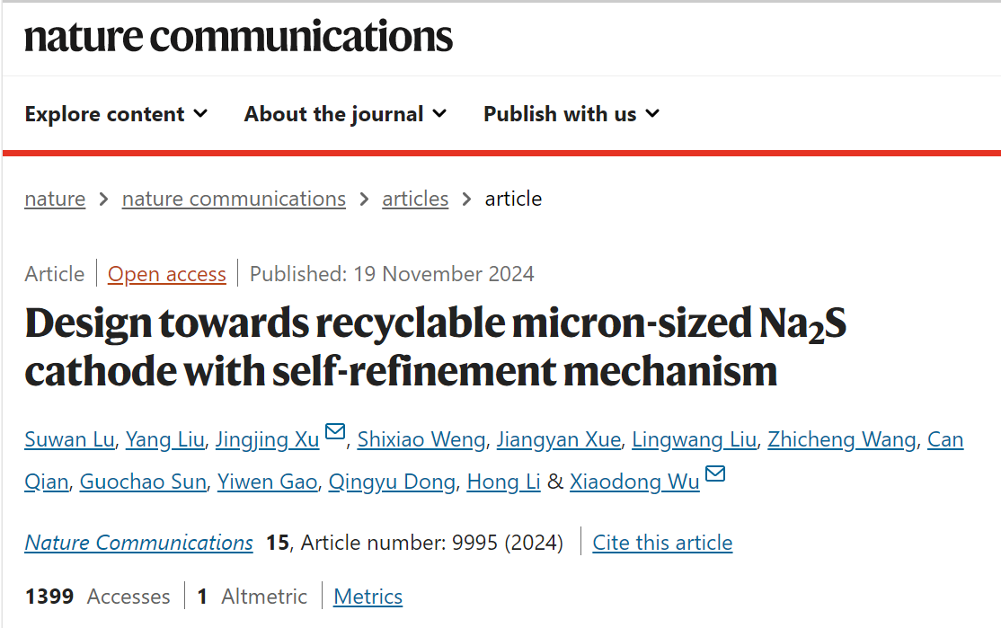 许晶晶研究员以共同通讯作者身份在国际知名期刊《Nature Communications》上发表了题为“Design towards recyclable micron-sized Na2S cathode with self-refinement mechanism”的研究性论文。中国科学院苏州纳米技术与纳米仿生研究所吴晓东研究员为论文共同通讯作者。