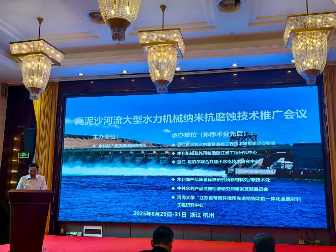 2025年8月29日- 30日,由水利部产品质量标准研究所主办的“高泥沙河流大型水力机械纳米抗磨蚀技术推广会议”在浙江杭州举行,加勒逼 “江苏省苛刻环境用先进结构功能一体化金属材料工程研究中心”与浙江省水利水电装备表面工程技术研究重点实验室等多家单位联合承办。