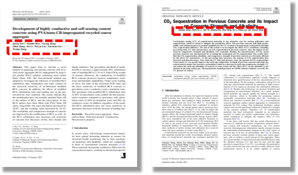 经过一年的研究探索,该项目在徐金霞老师、蒋臣君学长的指导下已完成,于SCI期刊《Journal of Materials Engineering and Performance》发表论文《CO2 sequestration in pervious concrete and its impact on concrete strength and alkalinity》一篇,于SCI期刊《Materials and Structures》发表论文《Development of highly conductive and self-sensing cement concrete using PVA/nano CB-impregnated recycled coarse aggregate》一篇。