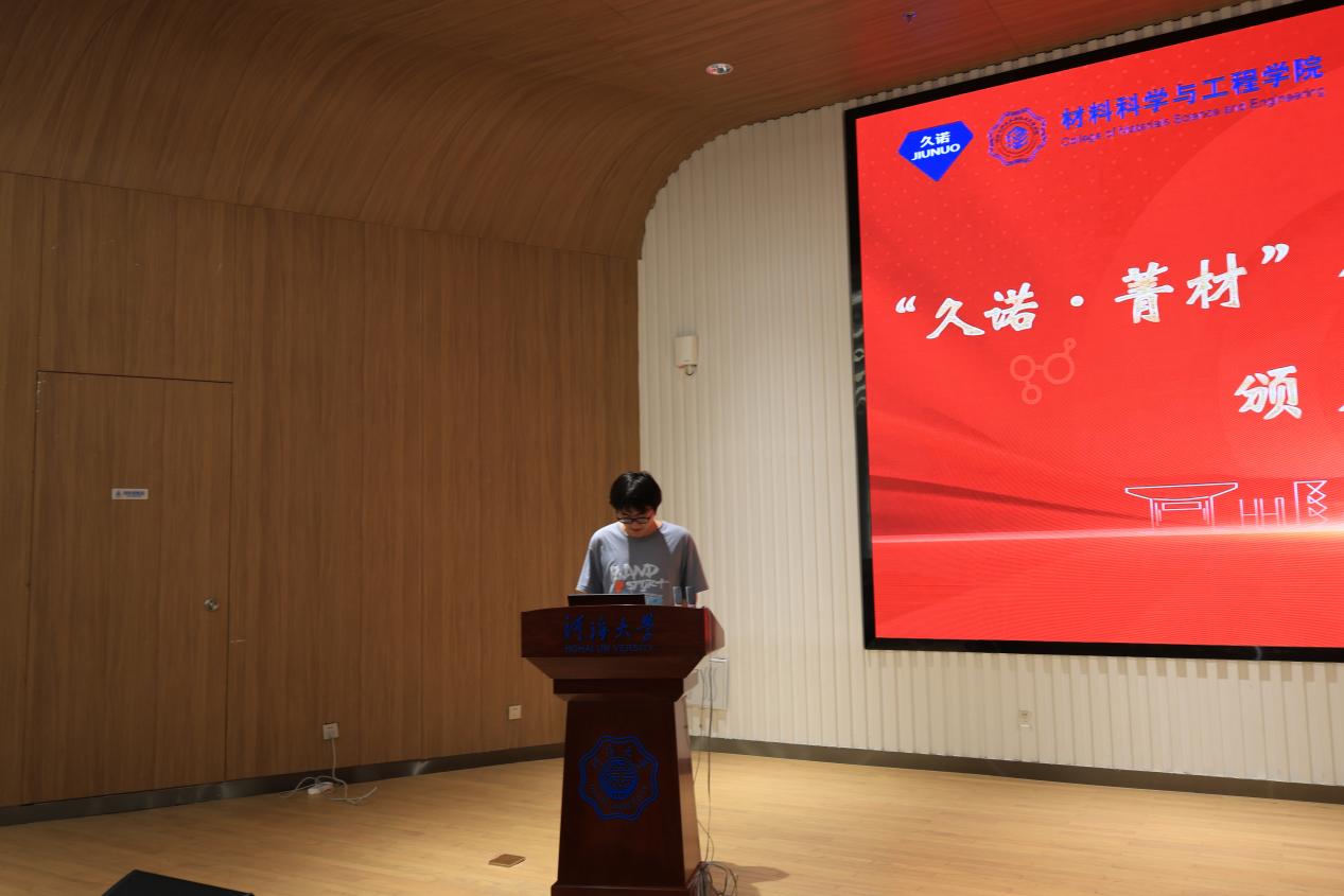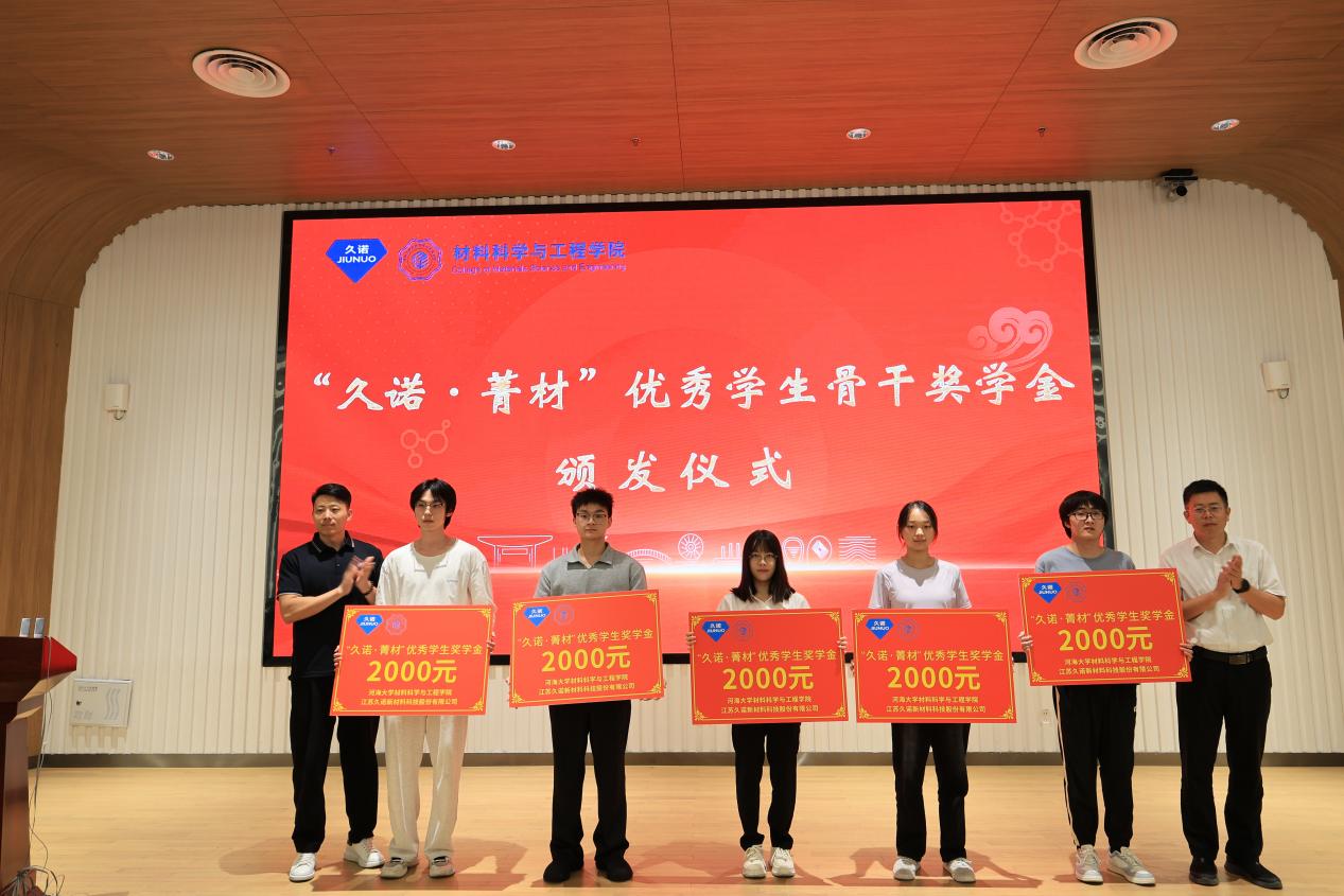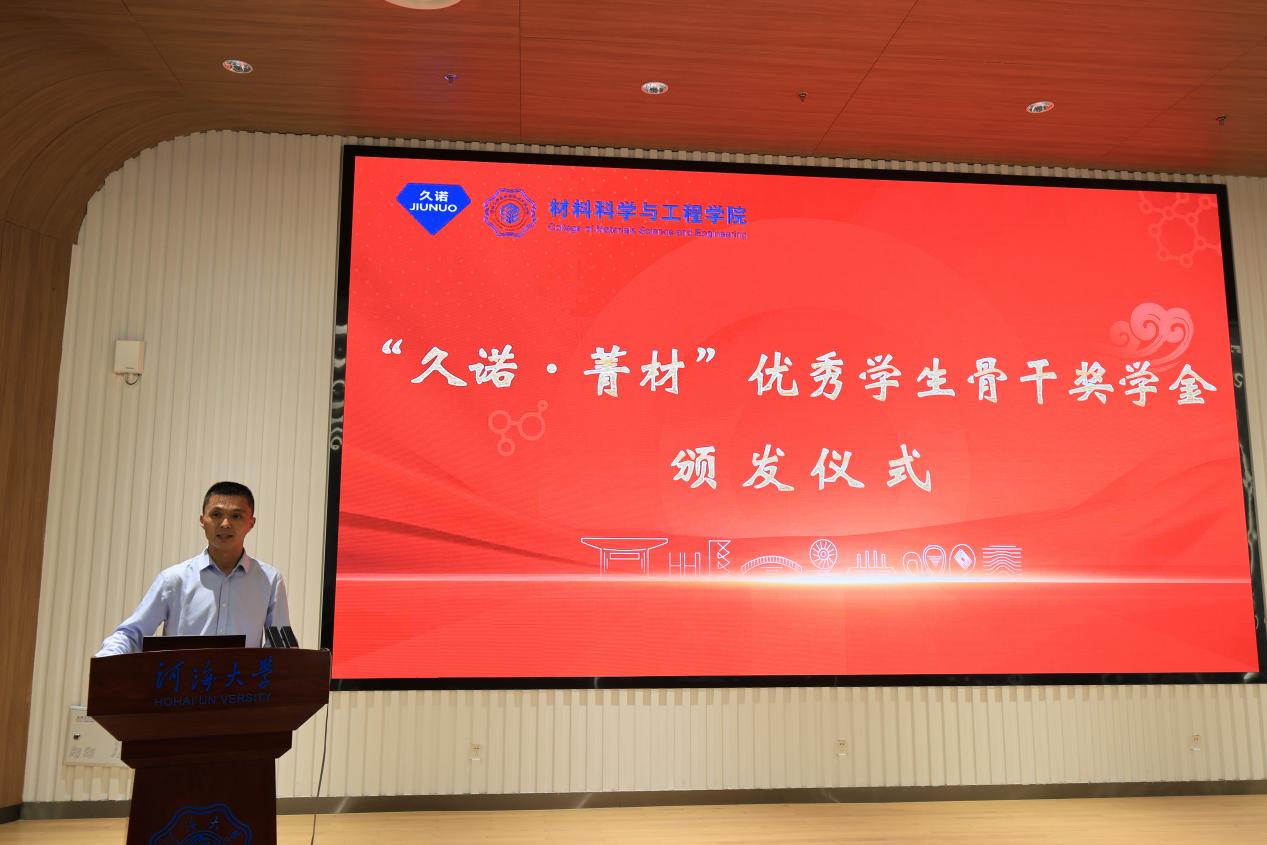 学院党委副书记、副院长辛绍权向江苏久诺新材料科技股份有限公司对学院人才培养工作的大力支持表示衷心感谢,并向荣获殊荣的五位同学表示热烈祝贺。他指出,“久诺·菁材”优秀学生骨干奖学金的设立,是对优秀学生推免升学本院以及优秀学生骨干服务精神、领导能力与综合素养的高度认可。他勉励全体同学以获奖者为标杆,勤于学习、勇于实践、甘于奉献,努力成长为可堪大用、能担重任的栋梁之材。