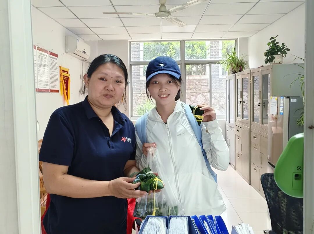 经过耐心蒸煮,粽香弥漫开来。同学们小心地将热气腾腾的粽子分装,并前往各宿舍楼送给宿管阿姨和班级同学。当同学们将饱含心意的粽子送到宿管阿姨手中时,惊喜与感动瞬间点亮了阿姨们的面庞。